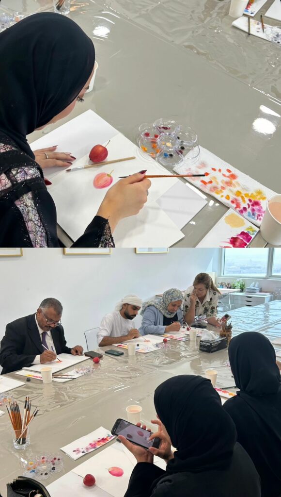 بعد الجولة توجه الطلاب إلى ورشة الرسم النباتي بالألوان المائية التي قدمتها المدربة شايفون. كانت الورشة فرصة لهم للابتعاد عن زخم الدراسة الجامعية والانغماس في تجربة فنية تتطلب هدوءاً وتركيزاً. شرحت المدربة مبادئ تشكيل الأجسام باستخدام الضوء والظل، وكيفية المزج بين درجات اللون للحصول على شكل أقرب إلى الواقعية. ثم طلبت من كل طالب اختيار ورقة فارغة ومحاولة رسم عنصر نباتي بسيط، غالباً تفاحة صغيرة أو ورقة نباتية، ليبدأ الجميع فوراً في التجربة.