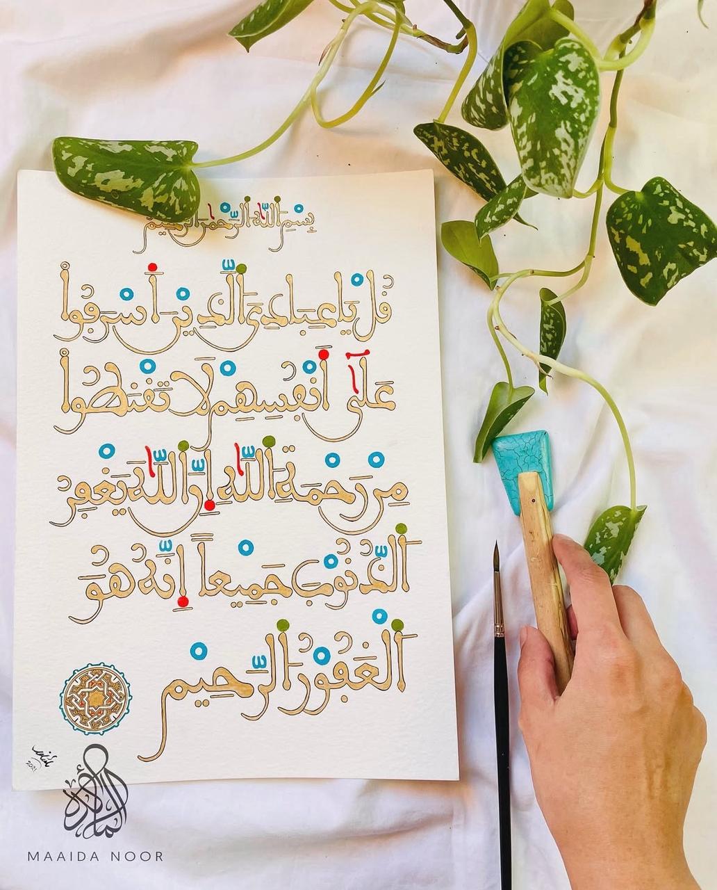 مايدة نور فنانة بريطانية من أصول باكستانية، حائزة على جوائز فنية. تستلهم أعمالها من تراث الفنون الإسلامية المتنوّع، وتمزج بين أساليب من المغرب العربي والفاطميين والصفويين والمغول والهنود. تعتبر أن الفن بالنسبة لها شكل من أشكال التأمل والصلاة، حيث تستخدم آيات من النصوص المقدسة الإسلامية لتجسيد الارتباط الإنساني مع الأبدي. تهدف من خلال فنها إلى تذكيرنا بجوهر وحدتنا مع الطبيعة والعودة إلى المحبوب
