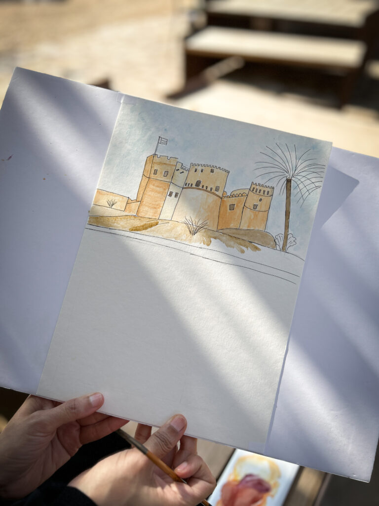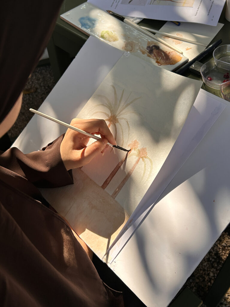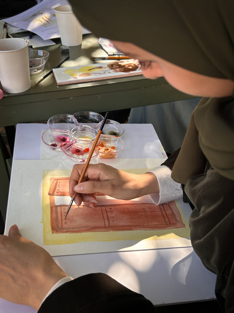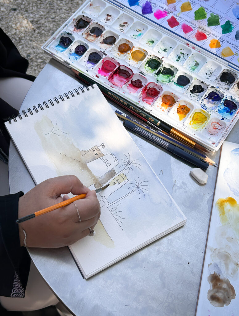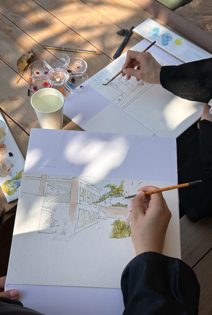 بدأت الورشة بجولة تأملية في أرجاء بيت الفن، حيث تعرّف المشاركون على تفاصيل المكان من أقواس وأبواب وعناصر معمارية تقليدية، قبل الانتقال إلى مرحلة الرسم. ركزت الفنانة شيفون خلال الجلسة على تقنيات التعامل مع الألوان المائية، خصوصًا ما يتعلق بالشفافية، وبناء الطبقات اللونية، وكيفية ترجمة الضوء والظل إلى تكوين بصري متوازن