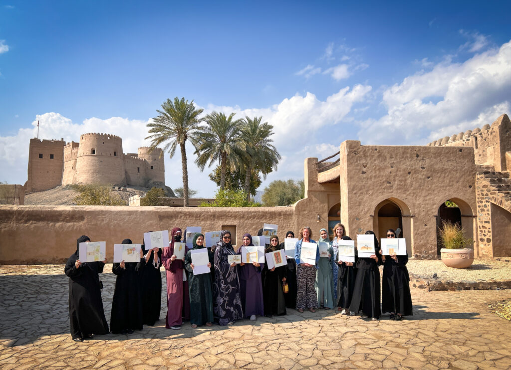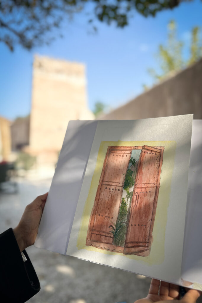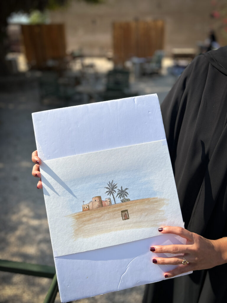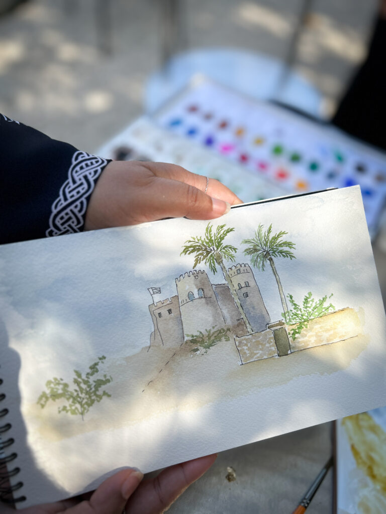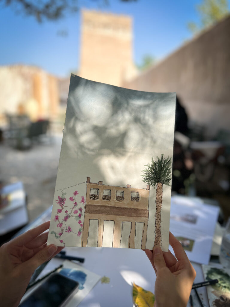 بدأت الورشة بجولة تأملية في أرجاء بيت الفن، حيث تعرّف المشاركون على تفاصيل المكان من أقواس وأبواب وعناصر معمارية تقليدية، قبل الانتقال إلى مرحلة الرسم. ركزت الفنانة شيفون خلال الجلسة على تقنيات التعامل مع الألوان المائية، خصوصًا ما يتعلق بالشفافية، وبناء الطبقات اللونية، وكيفية ترجمة الضوء والظل إلى تكوين بصري متوازن