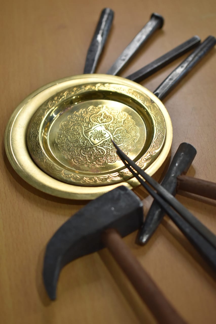 تتيح هذه الورشة للمشاركين التعرّف على فن النقش والزخرفة على النحاس باستخدام الأدوات التقليدية لصياغة الزخارف والخطوط الدقيقة على الأطباق المعدنية. يتعلّم المتدرّبون طرق نقل التصميم، وتثبيت المعدن، والتحكم في قوة الطرق لإبراز العمق والدقة في النقش. تهدف الورشة إلى منح المبتدئين فرصة لتعلّم مهارات الحرفة بأسلوب عملي يجمع بين الأصالة والدقّة، وصولًا إلى تنفيذ طبق نحاسي منقوش يدويًا يعكس الحسّ الفني للمشارك.