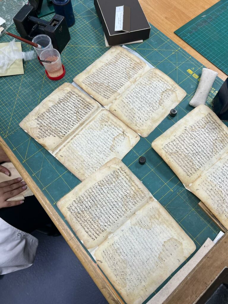 وشملت الجولة زيارة معمل ترميم المخطوطات، حيث تم الاطلاع على مراحل الترميم اليدوي، بدءاً من تقييم حالة المخطوط، مروراً بتنظيفه ومعالجة التلف، وصولاً إلى تثبيت الأجزاء المتضررة باستخدام مواد متخصصة تراعي المعايير الدولية في حفظ الوثائق التاريخية. كما تم استعراض أساليب الوقاية من العوامل البيئية التي قد تؤثر على الورق والحبر.